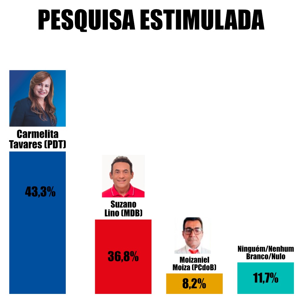 Em pesquisa realizada pela Empresa Lerigou Consultoria em Tecnologia / Gomes Comunicação, divulgada nesta sexta-feira (16), Carmelita Tavares (PDT) da Coligação “A Força de Aparecida do Rio Negro”  aparece com 43,3% das intenções de voto, na liderança da disputa pela prefeitura de Aparecida do Rio Negro.