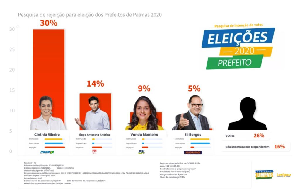 No fator rejeição a prefeita dispara negativamente: 30% dos eleitores consultados rejeitam ou reprovam Cínthia Ribeiro, que nesse quesito é seguida por Andrino, Vanda e Lelis, com 14, 9 e 8%, respectivamente. Vilela (PT) e Eli Borges (SD), têm 5% de rejeição, e Júnior Geo foi rejeitado por 3% dos entrevistados. Alan Barbiero (PODE), Gil Barison (Republicanos), Joaquim Rocha (PMB), João Bazoli (PSOL) e Max Dorneles (PTC) somam 2% de rejeição cada. 8% disseram que não rejeitava nenhum dos candidatos, e 8% não souberam responder.