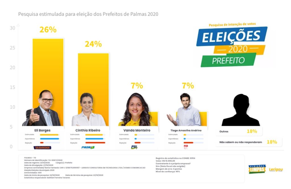 Eli Borges, que tem como vice o empreendedor Joseph Madeira (PTB) foi o último candidato a colocar sua campanha na rua. Já na semana seguinte assumiu a segunda colocação e em meados de outubro empatou tecnicamente com a candidaita do PSDB e em seguida assumiu a liderança. Nessa última semana, em que espera um trabalho intenso dos candidatos, Eli Borges poderá se distanciar de Cíntia a se isolar na liderança, com ampla possibilidade de ser eleito prefeito de Palmas no próximo domingo, dia 15.
