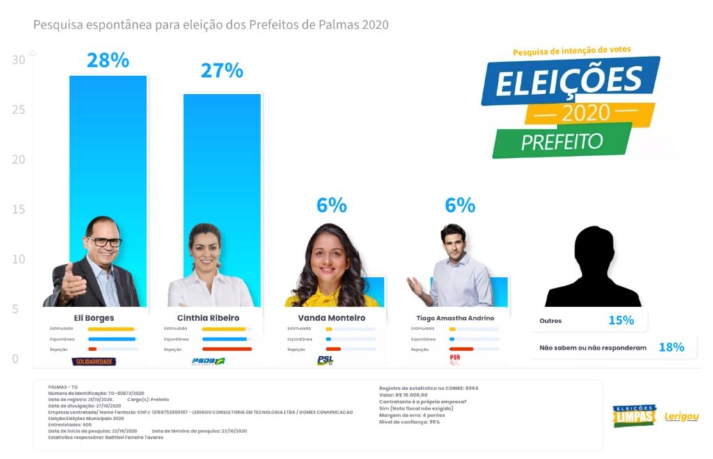 De acordo com o levantamento na modalidade espontânea Eli Borges (SD) aparece agora com 28%, ainda tecnicamente empatado com Cínthia Ribeiro (PSDB), que teria 27%, seguida por Vanda Monteiro (PSL) e Tiago Amastha Andriano, empatados com 6% cada um. Júnior Geo (PROS) aparece com 5%, Marcelo Lelis (PV) com 4%, Gil Barison (Republicanos) com 3%. Nessa modalidade Max Dornellys (PTC) figura com 2%. João Bazoli (PSOL) tem 1%, enquanto o Dr. Joaquim Rocha (PMB), Alan Barbiero (PODE) e Vilela (PT) aparecem na pesquisa com 0%. Dos 600 eleitores consultados 9% não souberam responder e 9% disseram que não votariam em nenhum dos candidatos que concorrem ao cargo de prefeito de Palmas em 2020.