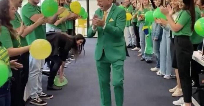 O empresário publicou um vídeo em suas redes sociais em que mostra os funcionários da loja aguardando sua chegada com balões verdes e amarelos e bandeiras do Brasil, enquanto cantam o hino da empresa.