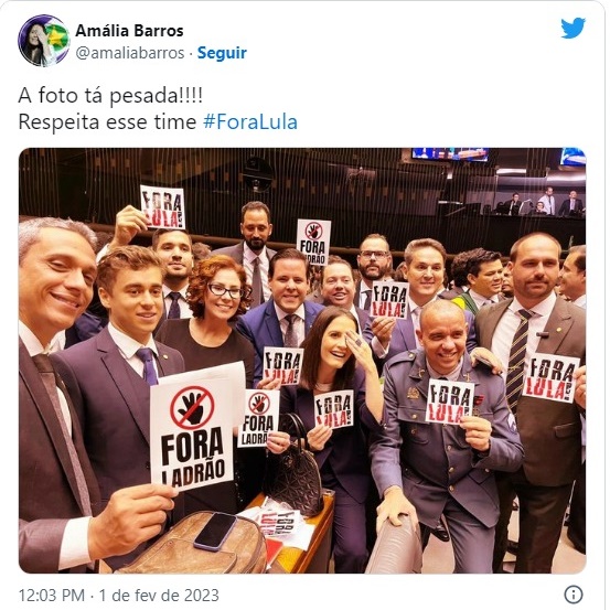 Deputados federais foram à cerimônia de posse na Câmara nesta quarta-feira, 1º, com adesivos de “Fora, Lula” e “Fora, ladrão” colados nas roupas. Fotografias e vídeos de parlamentares do Partido Liberal (PL), sigla do ex-presidente Jair Bolsonaro, foram publicados nas redes sociais.