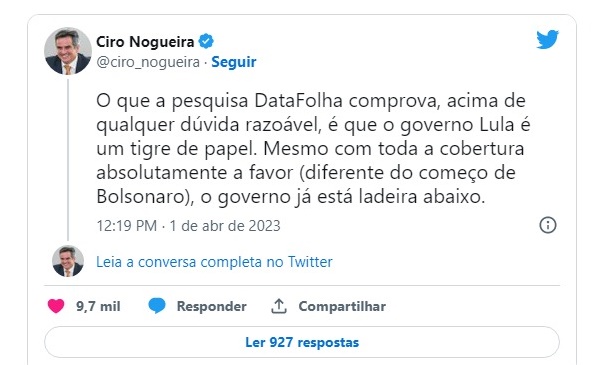 O senador Ciro Nogueira (PP) comentou neste sábado (1º) a pesquisa Datafolha sobre o índice de aprovação do governo Lula no início de seu terceiro mandato. Em uma publicação no Twitter, o líder do partido afirmou que a pesquisa comprova, “acima de qualquer dúvida razoável, é que o governo Lula é um tigre de papel”.