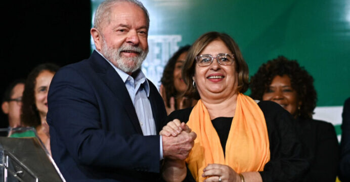 AME2358. BRASILIA (BRASIL), 22/12/2022.- El presidente electo de Brasil, Luiz Inácio Lula da Silva, posa hoy con la designada ministra de Mujeres, Cida Gonçalves, durante una conferencia de prensa sobre el informe final de la transición y para anunciar a 16 ministros de su futuro Gobierno, en Brasilia (Brasil). Lula anunció este jueves a 16 de sus próximos ministros e incluyó entre ellos, como titular de Industria y Comercio, al futuro vicepresidente, Geraldo Alckmin. Lula asumirá la Presidencia el próximo 1 de enero y ha anunciado que elevará a 37 el número de ministerios, frente a los 23 que tenía el Gobierno del ultraderechista Jair Bolsonaro. EFE/André Borges