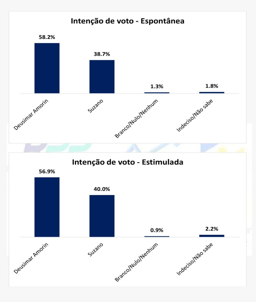 Na pesquisa estimulada Deusimar também está com vantagem, contabilizando 56,9%, enquanto o adversário tem 40%. Brancos e nulos somam 0,9%, e não souberam responder e indecisos foram 2,2%.