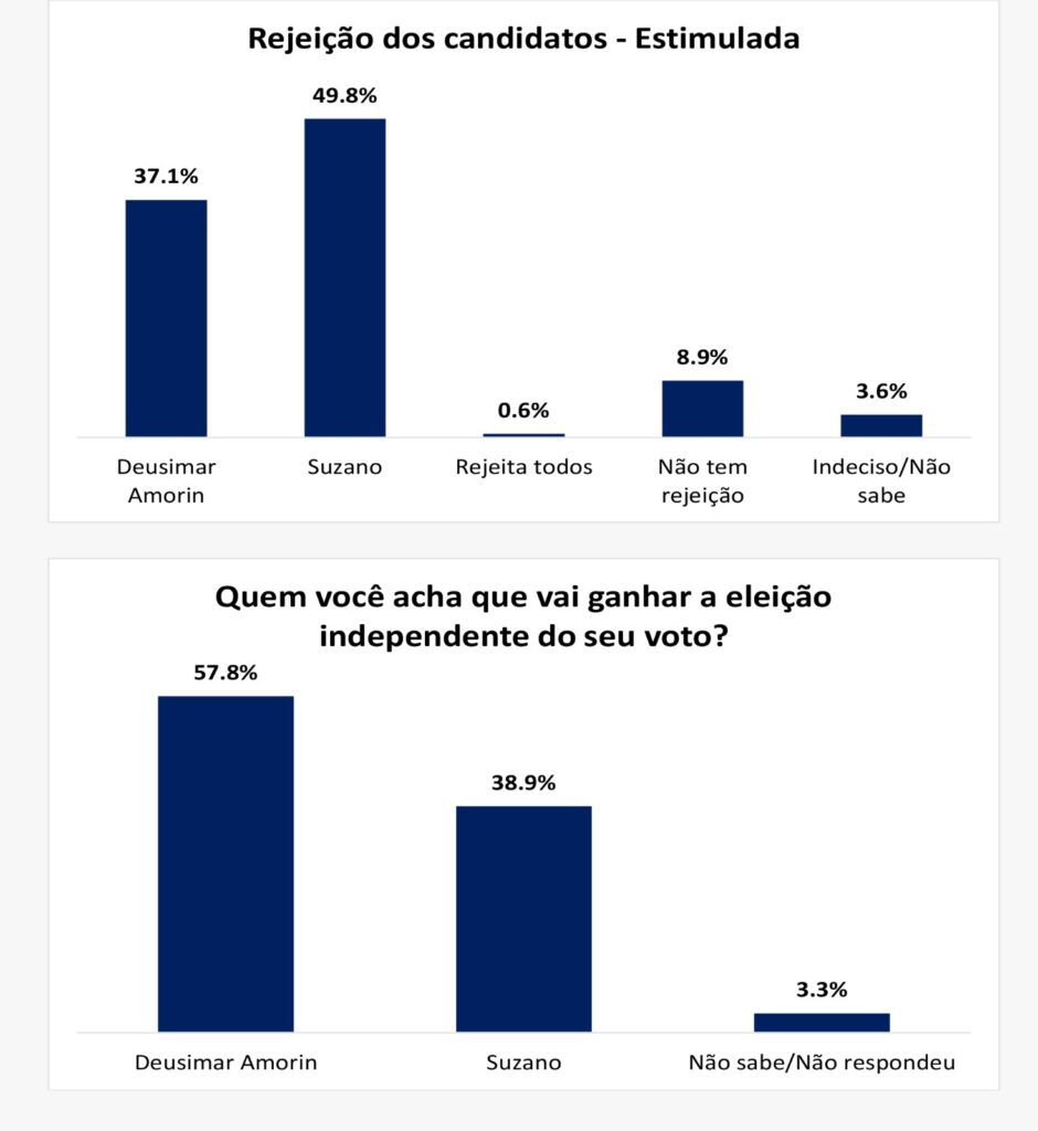 Nos índices de rejeição, que indicam a reprovação dos eleitores, o atual prefeito e candidato à reeleição Suzano Marques (UB) lidera, com 49,8% de rejeição. Os que não souberam responder foram 8,9%, rejeitam todos 0,6, e indecisos e não souberam responder somam 3,6%.