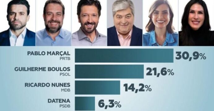 Em segundo lugar, aparece Guilherme Boulos (PSOL) com 21,6%, seguido pelo atual prefeito, Ricardo Nunes (MDB), que conta com 14,2% das preferências dos eleitores. José Luiz Datena (PSDB), conhecido pelo público como Datena, ocupa a quarta posição com 6,3% das intenções de voto, enquanto Tabata Amaral (PSB) vem logo atrás, com 5,8%. Maria Helena (NOVO) aparece na sequência, com 3,6%.