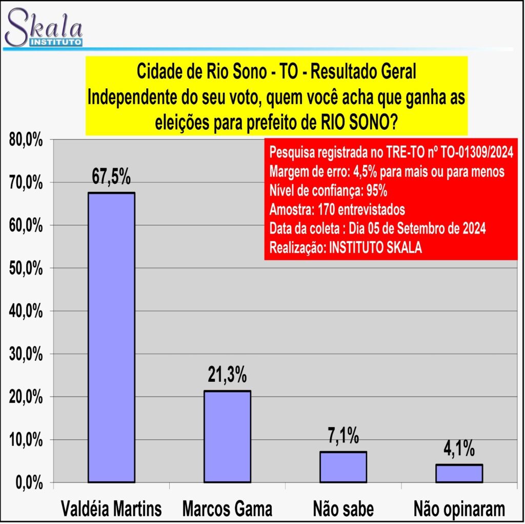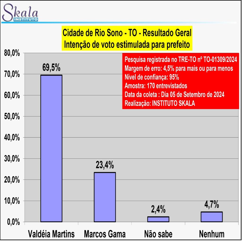 Uma pesquisa realizada pelo Instituto Skala em Rio Sono aponta que a candidata a prefeita Valdéia Martins (Republicanos) está na liderança das intenções de voto. Na pesquisa estimulada para prefeito, a postulante que busca uma vaga ao lado do candidato a vice, Willian Soares, tem 69,5% dos votos. O segundo colocado Marcos Gama, tem 23,4%, os que não souberam responder são 2,4% e 4,7% dos entrevistados afirmaram que não votariam em nenhum dos candidatos.