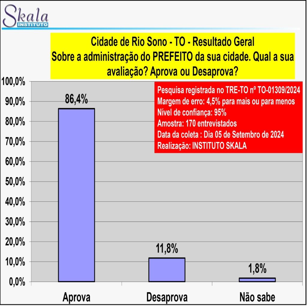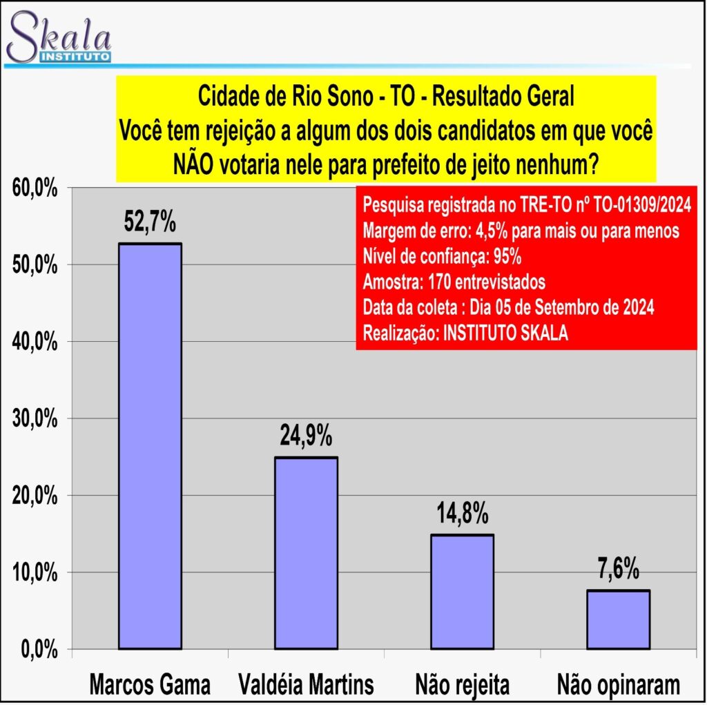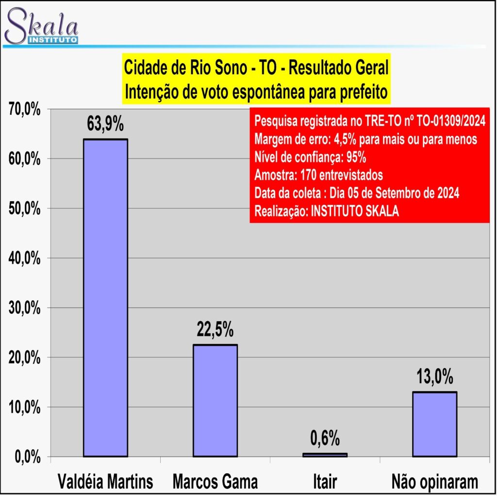 Registrada no TRE-TO nº TO-01309/2024, a pesquisa entrevistou 170 pessoas no dia 5 de setembro de 2024, e tem nível de confiança de 95%, além da margem de erro de 4,5% para mais ou para menos.
