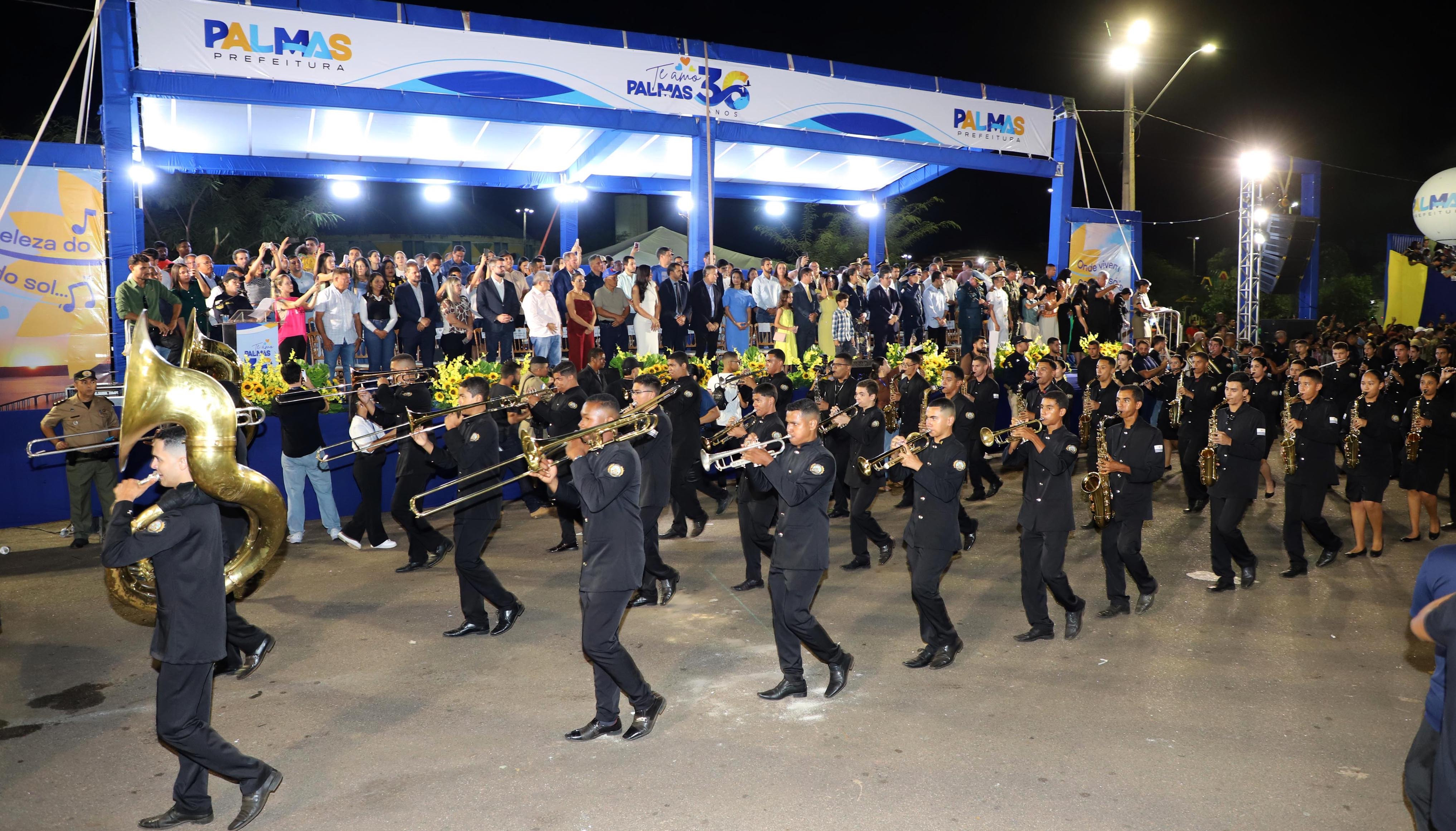 O tradicional desfile cívico-militar para homenagear a fundação, história e cultura integra a programação comemorativa pelos 36 anos de Palmas e ocorre após as celebrações no Paço Municipal, na Praça do Bosque dos Pioneiros, onde foram realizados o hasteamento das bandeiras, a execução dos hinos e o corte do bolo comemorativo. O desfile reuniu cerca de 2.400 participantes, envolvendo 22 instituições, incluindo a Banda de Música dos Fuzileiros Navais do 3º Batalhão de Proteção e Defesa Nuclear, Biológica, Química e Radiológica de Brasília com apresentação cultural; a Capitania Fluvial do Araguaia; 22º Batalhão de Infantaria Mecanizado; Polícia Militar do Estado do Tocantins (PMTO); Polícia Federal; dentre outras entidades civis e militares; e escolas municipais e estaduais.